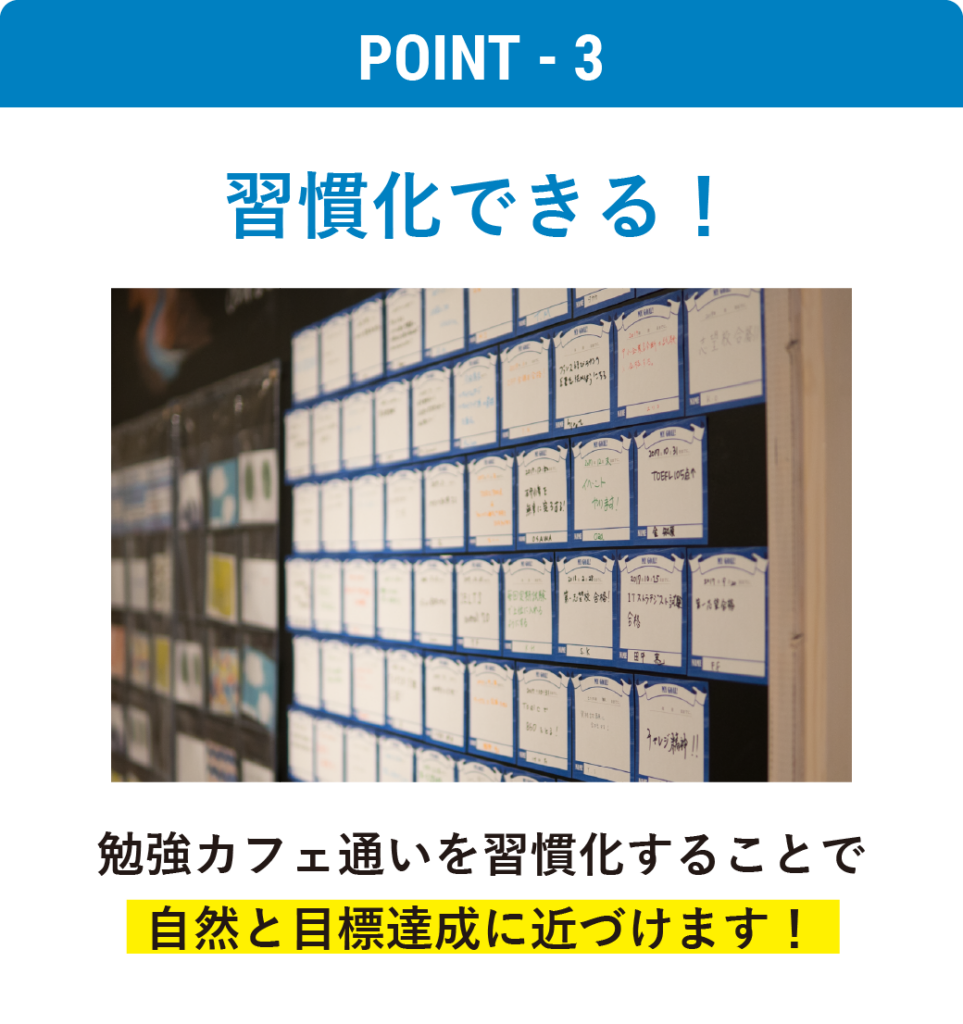 勉強カフェは、「集中できない」「やる気が出ない」「継続できない」といった勉強にまつわるお悩みをすべて解消し、目標達成にもっとも近づける伴走型の自習室です。